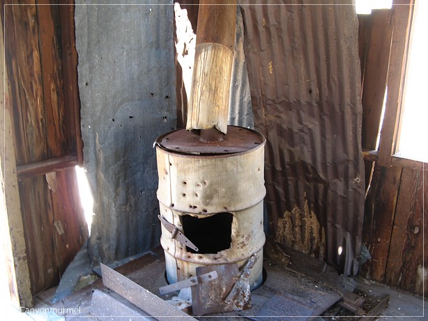 Der Boden ist so gut, daß man es betreten kann. Es steht noch ein rostiges Bettgestell drin, das zweite liegt hinter der Hütte außerhalb, was man gut sehen kann, da die Hintertür ebenso fehlt wie die vordere. In einer Ecke steht ein selbstgefertigter Ofen. Er wurde aus einer Tonne gemacht. Mit einem großen Scharnier wurde eine Ofentür angebracht, oben führt ein Rohr aus der Hütte.