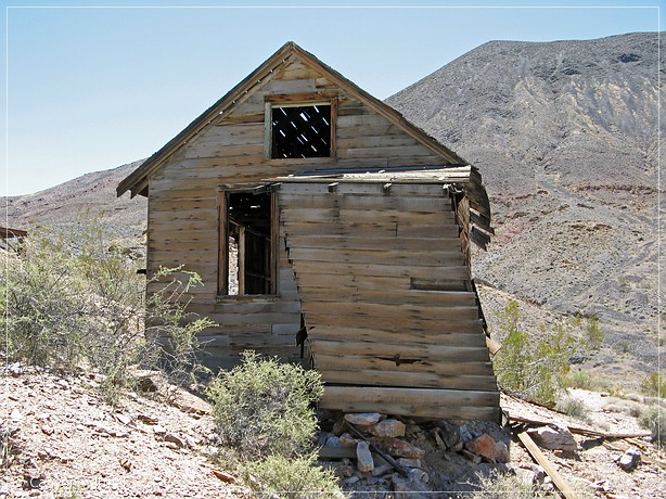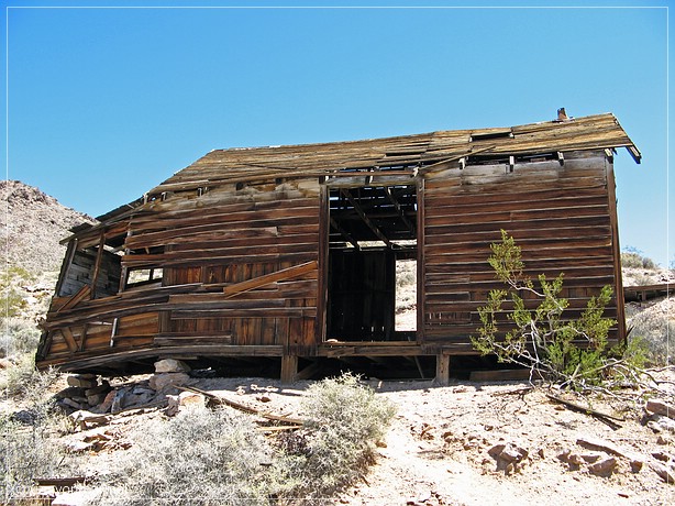 Nach exakt 9,4 Meilen biegen wir um eine Kurve und sehen die Mine links. Aber nicht nur die Mine, es gibt hier sogar noch eine Townsite. Mehrere Häuser sind noch einigermaßen intakt. Wir sind begeistert. Wir packen Foto, Ersatzbatterien, Speicherkarten, Filme und marschieren los. Zum Glück ist heute der Wind nicht mehr so stark, er weht zwar immer noch kalt, aber nur noch leicht. Es hat eigentlich eine angenehme Temperatur, wenn man sich bewegen will.