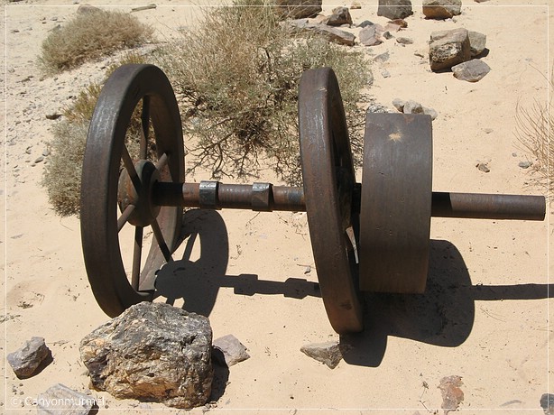 Wir kommen zu einer Erdhütte und einem aus Wellblech gebauten Gebäude mit kleinerem Holzgebäude davor. Sehr interessant sind auch die massiven Eisenräder, die hier teilweise im Sand liegen.