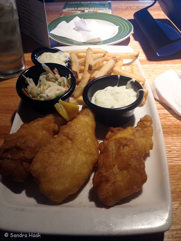 Happy Hour hieß auch, wir haben unseren geliebten Artischocken-Spinat-Dip für 4 $ als Vorspeise bekommen. Dann gab es für Klaus Bourbon Street Steak und für mich Battered Fishfilet mit 2 Tartarsaucen, lecker