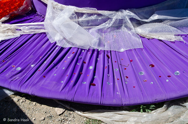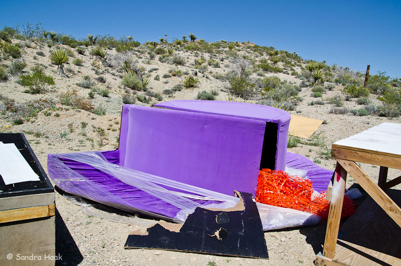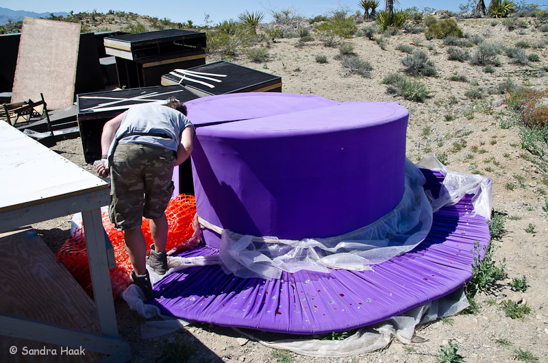 Und dann kam der Hammer Ein riesiger lila Hut, mitten in der Wüste, wie genial ist das denn Über und über war er mit bunten Strasssteinen beklebt.