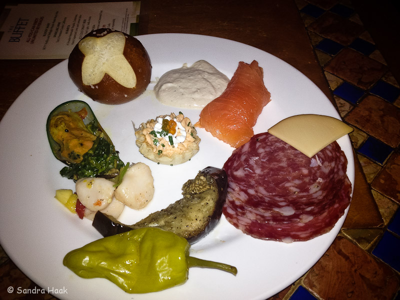 Ich hielt mich hauptsächlich an die kalten Leckereien. Das mit Lachs-Mousse gefüllte Törtchen, Bildmitte, war ein Traum Aber auch der Räucherlachs mit Meerrettichsauce, die Muscheln und Seafood-Delikatessen waren spitze. Wir schlemmten bis wir fast platzten