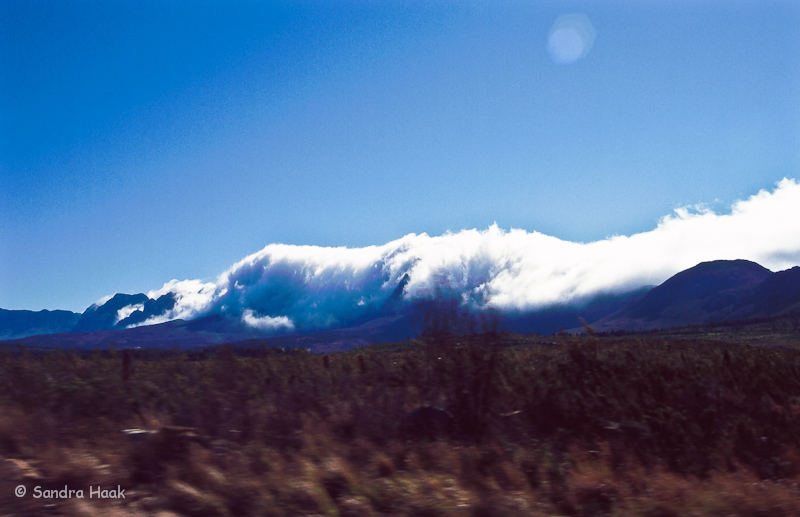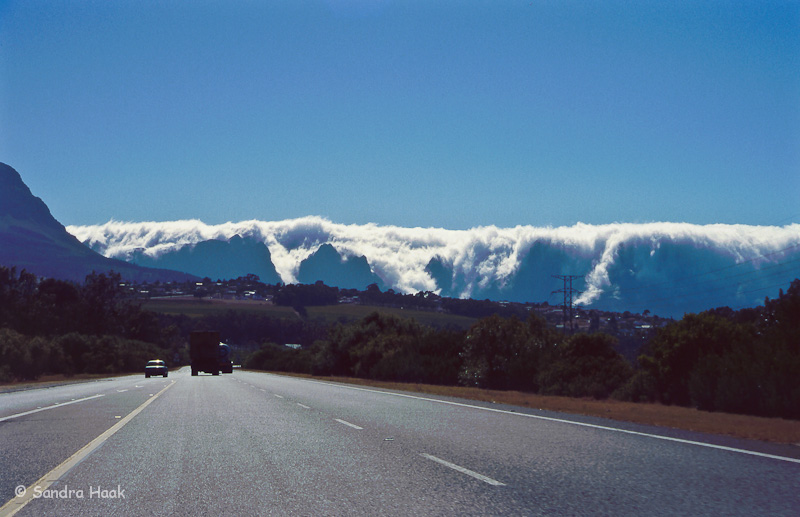 Hinter den Bergen stand eine Wolkenwand, das gefiel uns gar nicht. Als wir die Berge erreichten fuhren wir mitten durch dicke Wolken, hoffentlich sind die nicht auch in Wilderness, unserem heutigen Ziel. Dann begann es auch noch zu regnen, na toll