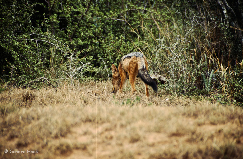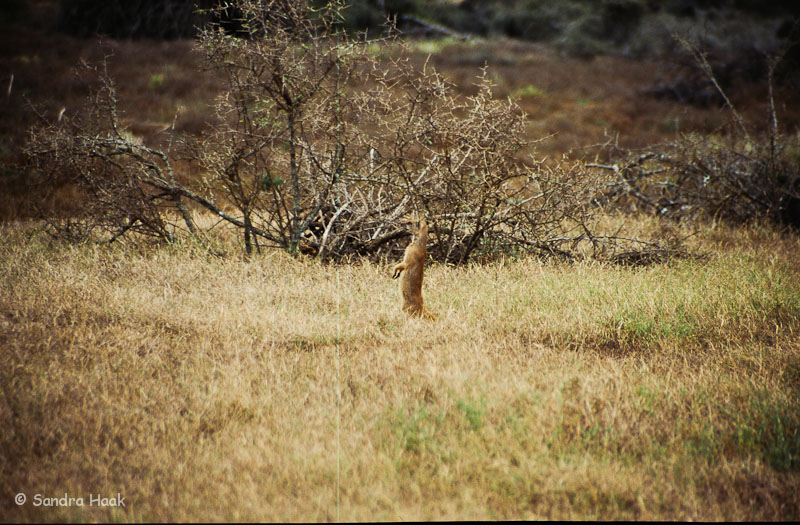 Im Park angekommen orientierten wir uns nach links. Wir sahen Guinea Fowls, Strauße, Schildkröten, Böcke, Erdmännchen und einen Schakal. Außerdem mit dem Fernglas Büffel und Zebras.