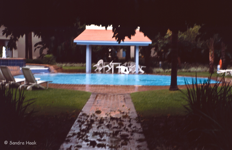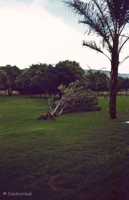 Um 15 Uhr wurde es plötzlich ganz finster, schwarze Wolken zogen heran. Wir gingen in unser Zimmer. Kaum waren wir drin, brach draußen die Hölle los. Es blitzte und donnerte, schüttete wie aus Kübeln, zwischendurch Hagel und dann begann der Sturm Sowas hatten wir noch nicht erlebt Die Bäume bogen sich, der Regen kam waagrecht und den Baum direkt vor unserem Fenster hat es entwurzelt. Was für eine Naturgewalt. Langsam wurde es wieder heller. Wir wagten uns nach draußen. Der Pool lief über, überall lagen Blätter und Äste.