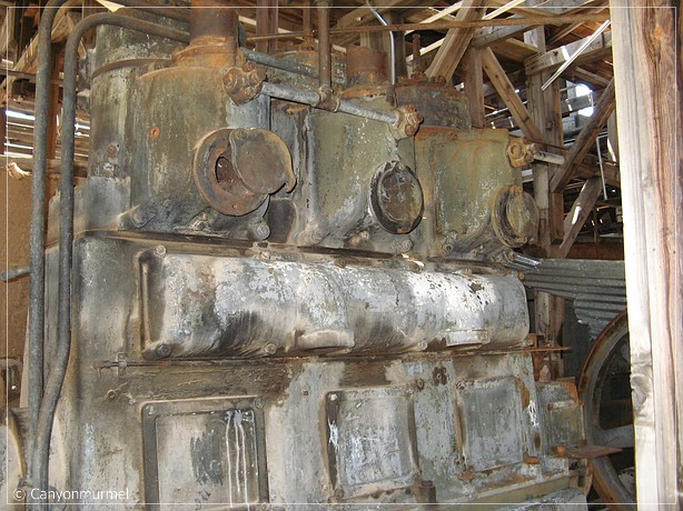 Es handelt sich bei der Ruine um eine riesige Halle, die voller alter Maschinen ist. Wir sind begeistert. Sogar ein Elektronikschrank mit verschiedenen Fächern ist da. Wir sind ganz von den Socken. Die Treppen sind noch so stabil, daß man auch in den oberen Stock kann. Hier steht unter anderem noch ein alter Schreibtisch und natürlich weitere Maschinen. Das ganze Gebäude ist mit Wellblech gedeckt. Viele Teile sind lose und klappern im Wind. Die offenen Türen schwingen alle im Wind und quietschen schauerlich. Es ist richtig unheimlich Wir halten uns bestimmt eine Stunde hier auf. Unbeschreiblich ist es hier.