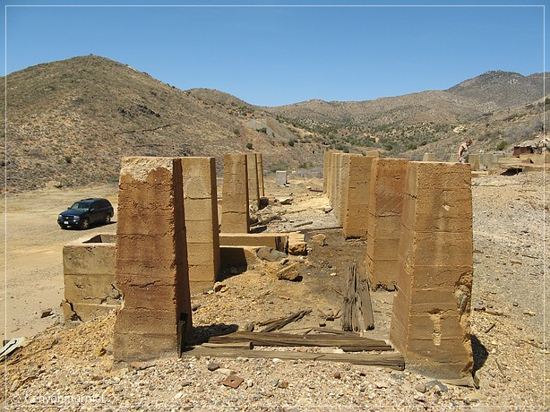 Als wir endlich ankommen, finden wir bunte Schmierereien an den Felswänden, die sogenannten Murals. Toll und dafür haben wir uns hierher gekämpft Später erfahren wir, daß Murals Felsmalereien heißt. Wir fahren enttäuscht zurück zur Mine, der Tennessee Mine, wie wir später erfahren. Dort werden wir entschädigt. Es sind noch sehr viele Überreste zu besichtigen.