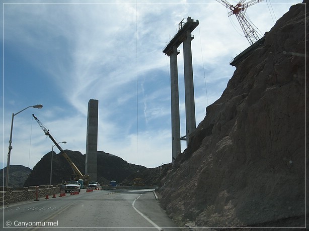 Nach einer Stunde fahren wir weiter nach Las Vegas. Bereits weit vorm Hoover Dam waren Schilder, daß Trucks, Busse und Trailer nicht mehr über den Dam fahren dürfen. Weitere Schilder weisen darauf hin, daß 9 Meilen vorm Dam eine Inspection Station ist, an der alle Fahrzeuge kontrolliert werden. Auch wird daraufhin gewiesen, daß der Bypass 2008 fertig sein soll. Man sieht deutlich, daß es mal 2007 geheißen hat, die 7 entfernt wurde und durch eine 8 ersetzt wurde. Als wir bei der Inspection Station ankommen werden wir, wie alle anderen Fahrzeuge auch, nur durchgewunken. Was für Kontrollen. Als wir uns dem Hoover Dam nähern, sieht man schon eine fertige Brücke, die wohl ein Teil der künftigen Bypass Strecke ist.