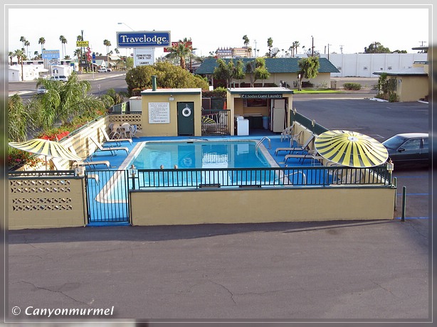 Als wir in Yuma ankamen, sahen wir, daß sogar die beiden Motel 6 60 $ verlangten. Ganz schön happig, hier sind wir sonst Preise von 36 $ gewöhnt. So hatten wir aber einen Anhaltspunkt. Wir fuhren den Business Loop und sahen rechts eine Travelodge. Scheinbar ganz frisch renoviert. Ein schöner großer Pool war auch da, er war offen und niemand war dort.