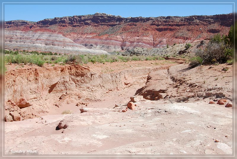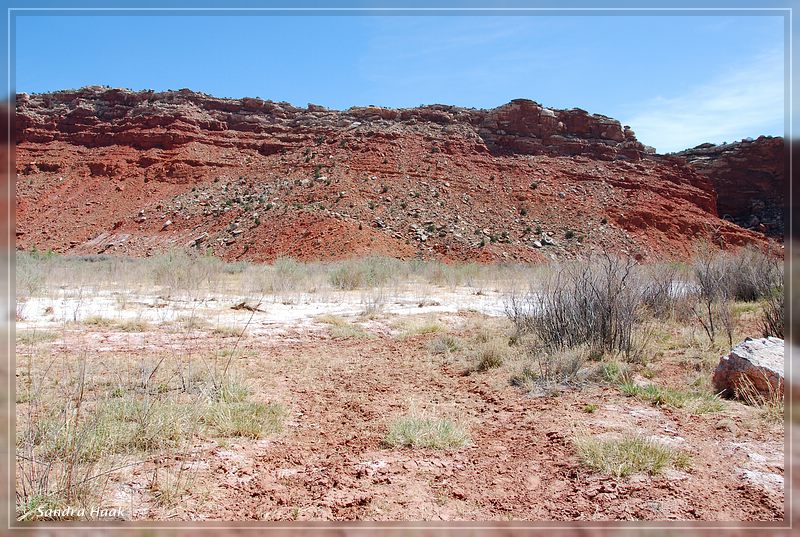 Wir entschlossen uns, nach Old Paria zu fahren und nochmal in Richtung Box Canyon zu wandern, in der Hoffnung, daß wir zwischen den Felsen vor dem Sturm geschützt waren. Unterwegs fragten wir uns, ob vielleicht mit dem Wiederaufbau von Old Paria schon begonnen wurde, aber als wir ankamen, sahen wir, daß sich gar nichts geändert hatte. Sieht so aus, als würden sie das nie mehr aufbauen, schade