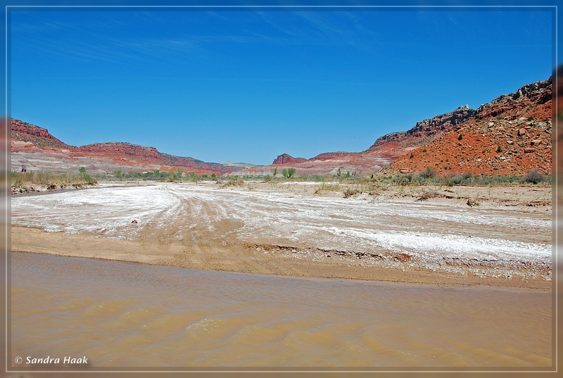 Wir fuhren so nahe es ging an den Fluß und den Box Canyon heran. Dann gingen wir los. Der Boden war mit einer Schicht Salz bedeckt und sah aus, als wäre er fest, aber denkste. Schon sanken wir ein.