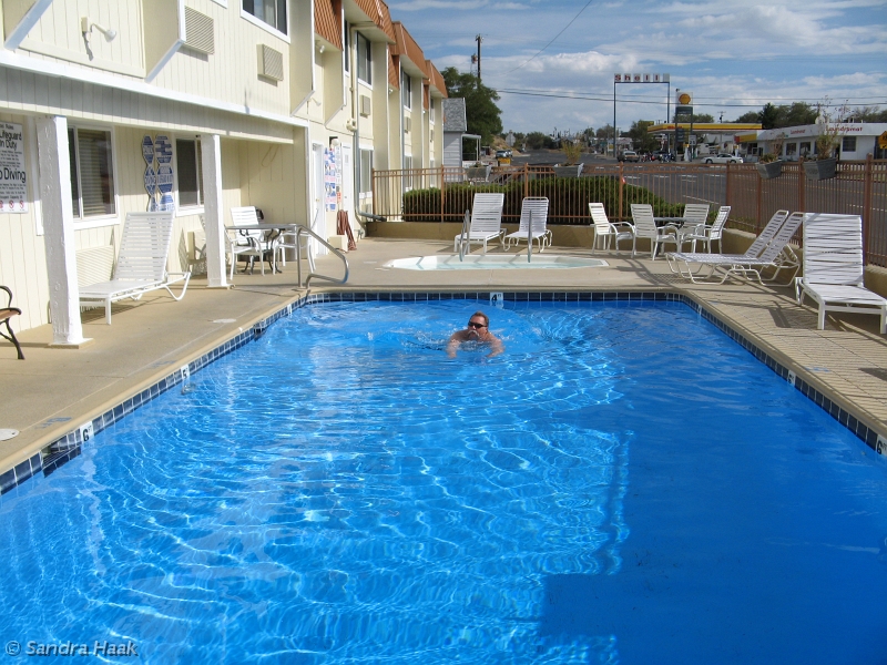 Wir tranken schnell ein kühles Bier, bevor wir an den Pool gingen. Der lag zwar an der Straße, da hier aber nur 25 mph erlaubt sind, ist der Verkehr ziemlich leise.