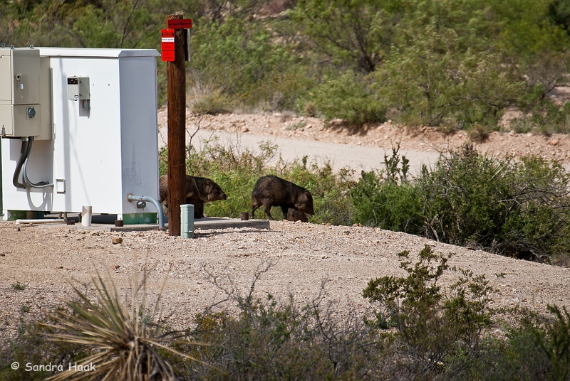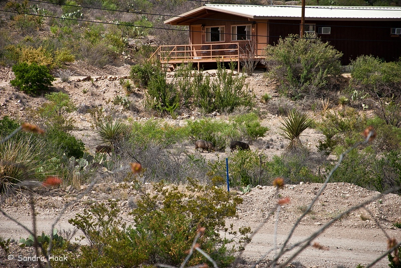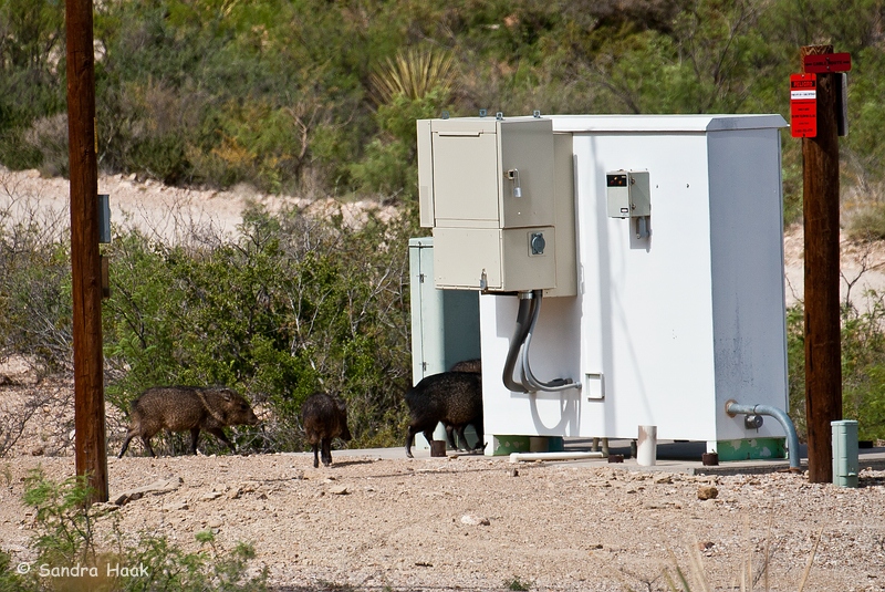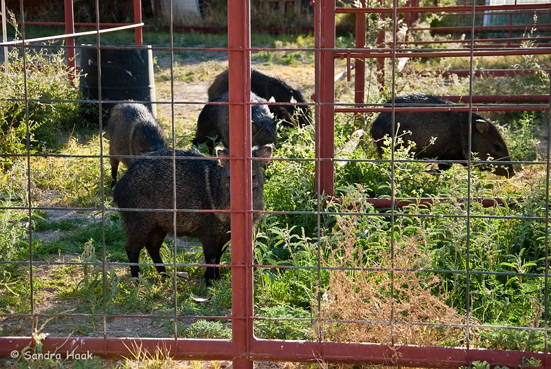 Plötzlich sah Klaus, daß die Javelinas wieder zurück sind, unten an den Pferdekoppeln. Wir also gleich ins Auto gesprungen und dorthin gefahren. Allerdings wirkten die Tiere in den Koppeln wie eingesperrt durch die Gitter. Das gefiel uns nicht und so sind wir zurück zu unserer Terrasse und beobachteten sie von dort weiter.