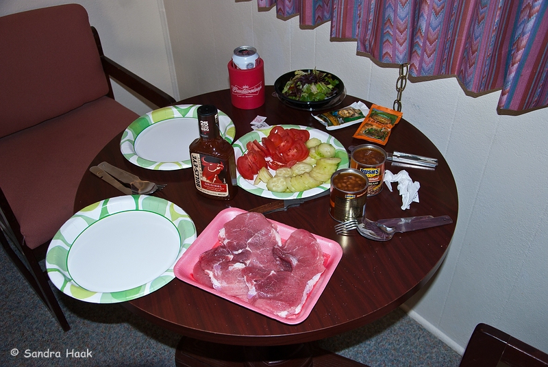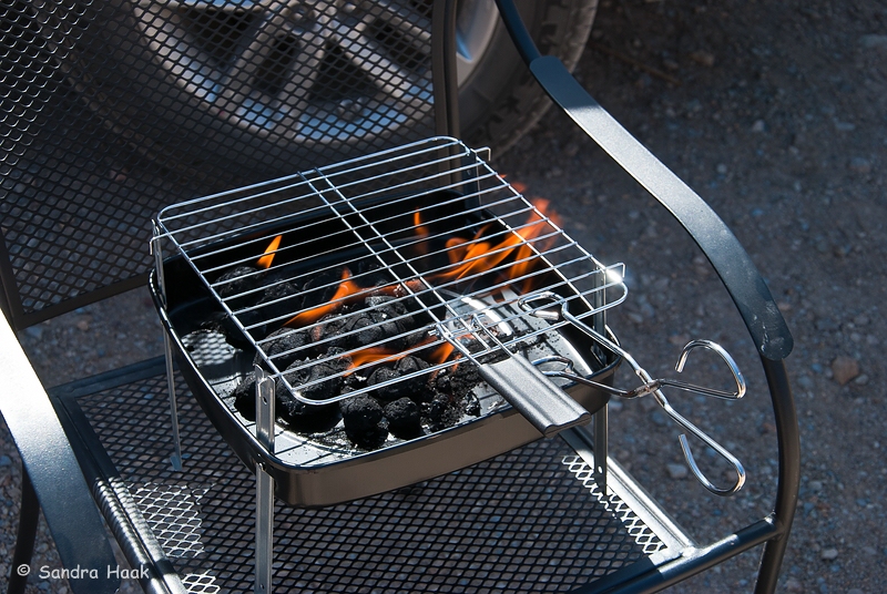 Leider gab es die gemauerten Grills nicht mehr wegen der Feuergefahr. Ich meinte, so ein Mist, wir haben Grillfleisch dabei, ob wir auf unserem eigenen Grill grillen dürften? Ja, aber nur auf dem Parkplatz, damit ja nix Feuer fängt. Welch ein Glück, daß wir einen kleinen Einweg-Grill beim Walmart gekauft hatten, damit wir den Rost nutzen konnten. Nun brauchten wir ihn dringend.
