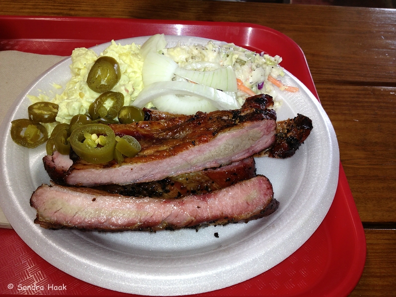 Es gab nur drei Gerichte zur Auswahl. Brisket, Ribs oder German Sausage. Diese mußte man selbst an einer Theke holen. Wir entschieden uns für Brisket und Ribs, wobei die Würste auch super aussahen.