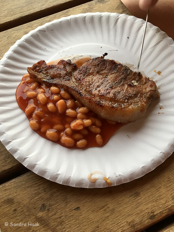 Um 18 Uhr kam pünktlich unser Essen, zwei Porkchops für Klaus und zwei Chickenkebabs für mich, dazu eine Dose Bohnen, die wir schon eine zeitlang spazieren fuhren.