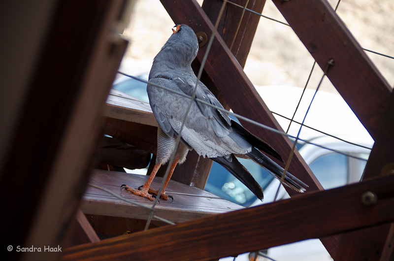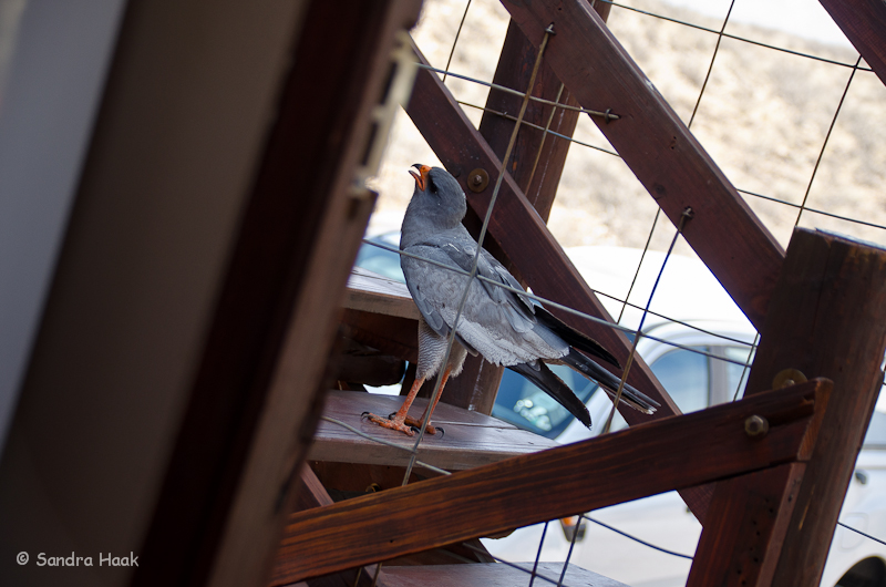 Kurz danach kam dieser Pale Chanting Goshawk angeflogen und setzte sich auf die Treppe zum Schlafzimmer.