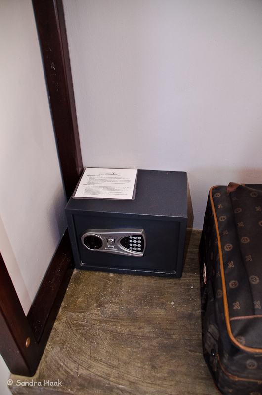 Die Chalets haben keine Air Condition, sondern nur einen Standventilator, der so gut wir gar nichts bringt. Ganz oben kann man rundrum Klappen öffnen, die Abkühlung bringen sollten, dies klappte aber erst am frühen Morgen. Die Klappen sind nicht durch Fliegengitter geschützt, was zur Folge hatte, dass wir eine handtellergroße Spinne im Zimmer hatten.