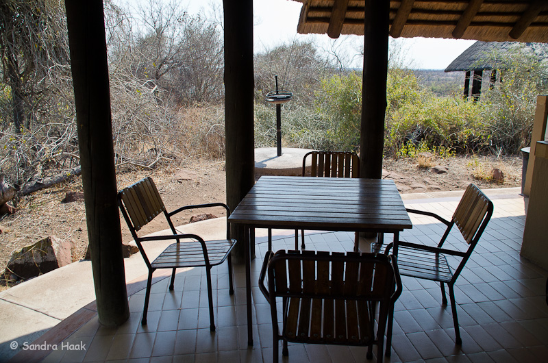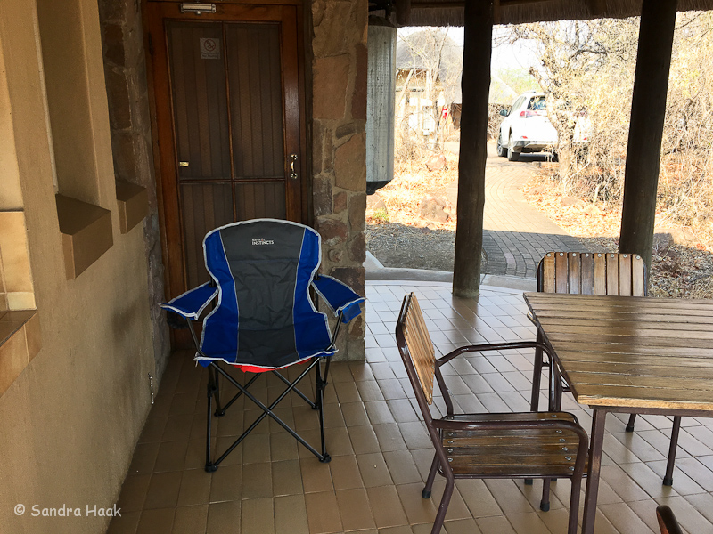 Jeder Bungalow hat eine Terrasse mit Außenküche und Grill. Es gibt einen Tisch mit 4 Stühlen auf der Terrasse. Die Aussicht von Unit 50 ist gleich null, man sieht nur Gebüsch und andere Bungalows. Und ein winziges Stück See.