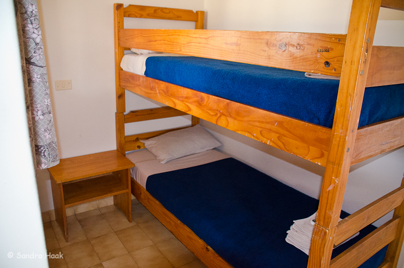 Es gibt ein Schlafzimmer mit 2 Single Beds, ein kleines Zimmer mit Stockbett und ein Bad mit Dusche und WC. Im Hauptschlafzimmer gibt es AC.