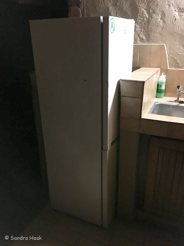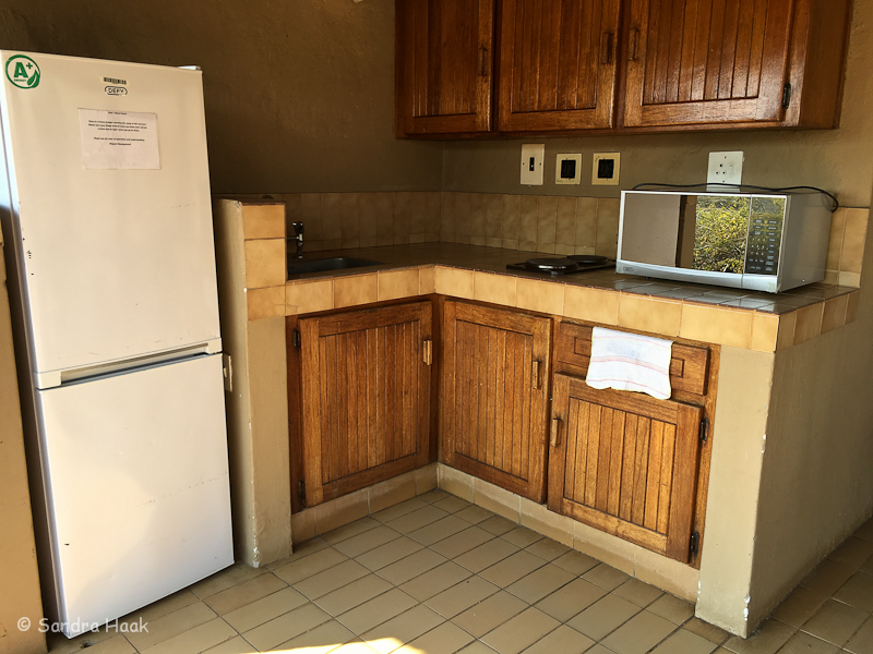 Die Küche besteht aus Spüle, 2 Kochplatten, Mikrowelle und Kühl-Gefrier-Kombi. Diese muss man bei Abwesenheit so drehen, dass die Tür von Tieren nicht geöffnet werden kann.
